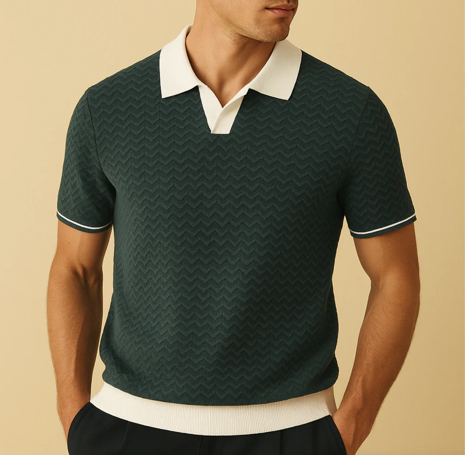 "Eleva tu día a día con la Polo Shirt Tissu Riccio de DELACROIX. Esta pieza redefine el concepto de polo clásica gracias a su innovador tejido de textura rizada. Su diseño impecable ofrece un ajuste cómodo y una apariencia sofisticada que transiciona sin esfuerzo del trabajo al fin de semana. Disponible en [Verde,Negro y Blanco], es la adición perfecta para el armario del hombre moderno que busca calidad y distinción sin esfuerzo."