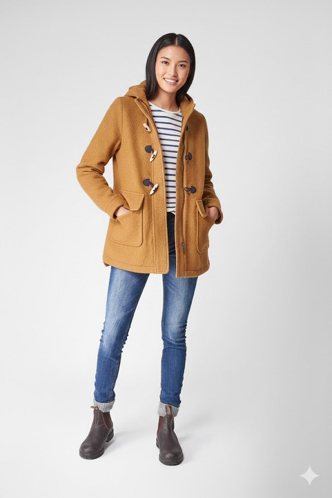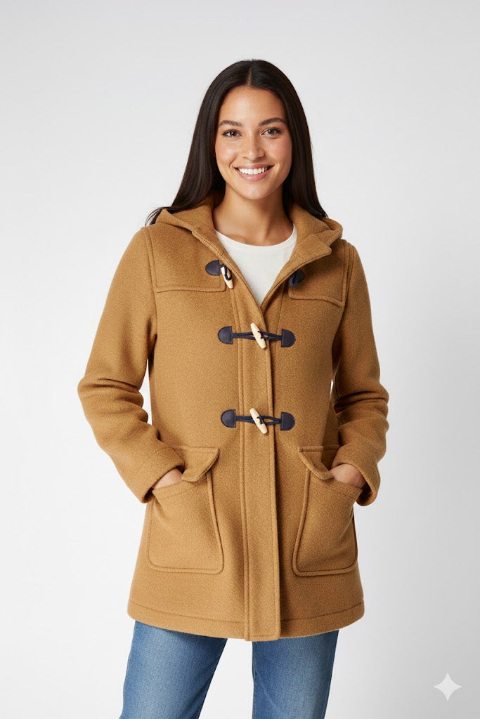 Este abrigo está hecho de lana cocida y tiene capucha, cierre de botones cuerno delante y bolsillos frontales.